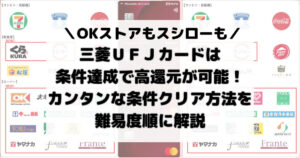 三菱UFJカードもスシロー、OKストアなどセブン‐イレブン以外の対象店舗も充実しており、何も条件を達成しなかったとしても5万円までは対象店舗で7.0%還元で使えるため、普段からこれらの店舗を利用する人には非常にメリットの多いカードです。
