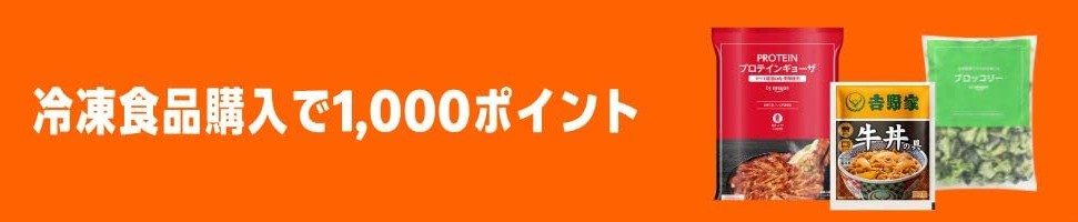 エントリーの上、キャンペーン期間中に対象の冷凍食品を1回の注文で6,000円以上購入すると1,000ポイント獲得できます。
