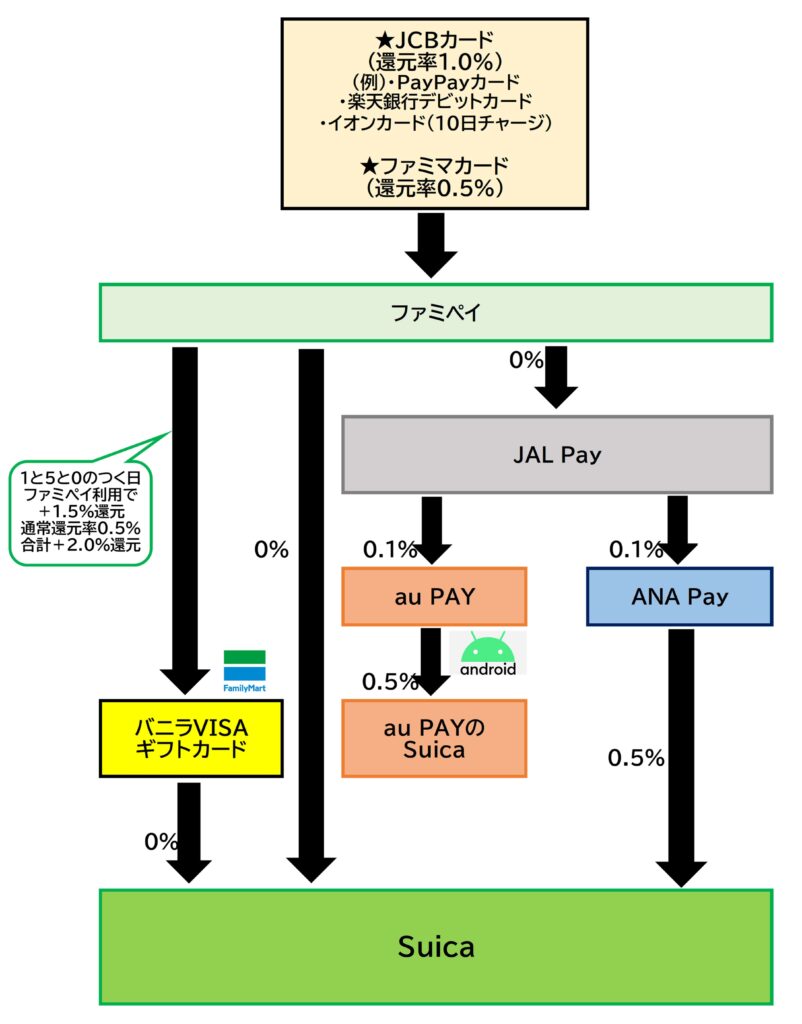 ルート1:JCBカード⇒ファミペイ⇒ファミマ店頭で1と5と0のつく日にバニラVISAギフトカードを購入⇒モバイルSuicaにチャージ(最大3.0%還元)