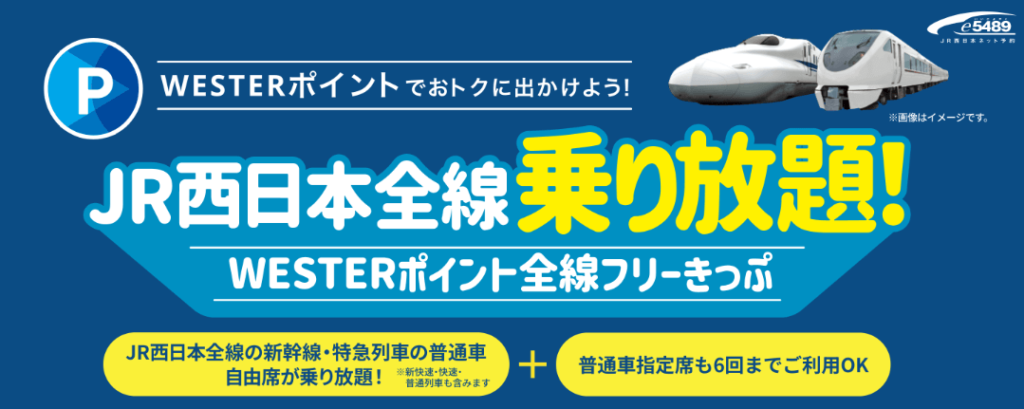 | 対象条件 | J-WESTカード会員限定 JR西日本ネット予約「e5489」で全額WESTERポイントで購入 購入に必要な「WESTERポイント」を保有する場合に限り予約可能 |